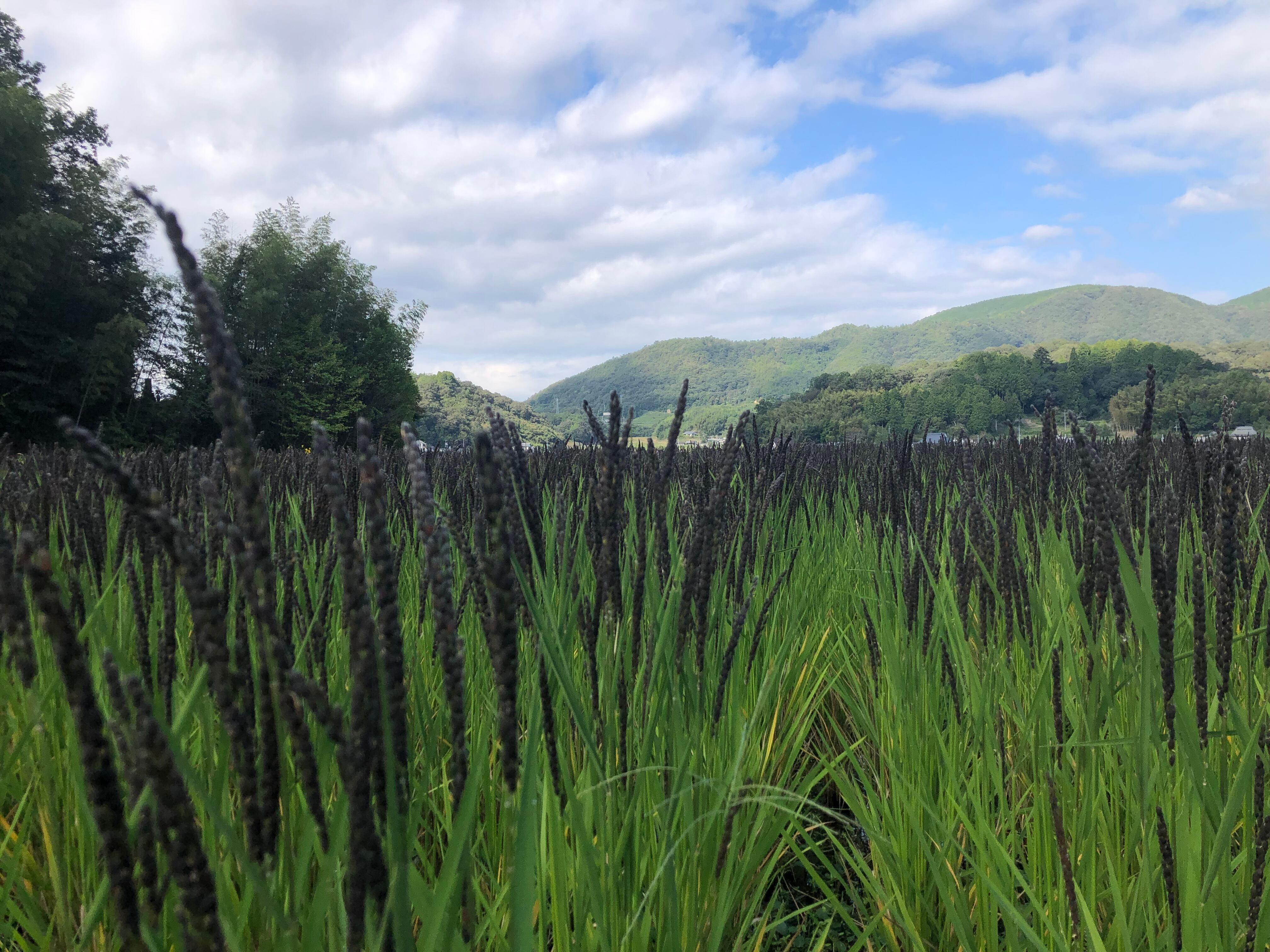 稲穂は美しい紫色ですが、玄米は表皮に含まれるクロロフィルという緑黄色野菜に含まれる成分によって緑色になります。